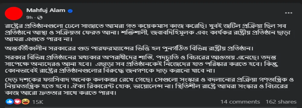 পোস্টে তিনি লেখেন, রাষ্ট্রের প্রতিষ্ঠানগুলো ঢেলে সাজাতে আমরা গত কয়েকমাস কাজ করেছি। খুবই জটিল প্রক্রিয়া ছিল সব প্রতিষ্ঠানে আস্থা ও সক্রিয়তা ফেরত আনা। শক্তিশালী, জবাবদিহিমূলক এবং কার্যকর রাষ্ট্রীয় প্রতিষ্ঠান ছাড়া আমরা এগুতে পারবো না। অন্তর্বর্তীকালীন সরকারের গুড পারফরম্যান্সের ভিত্তি হলো পুনর্গঠিত বিভিন্ন রাষ্ট্রীয় প্রতিষ্ঠান।