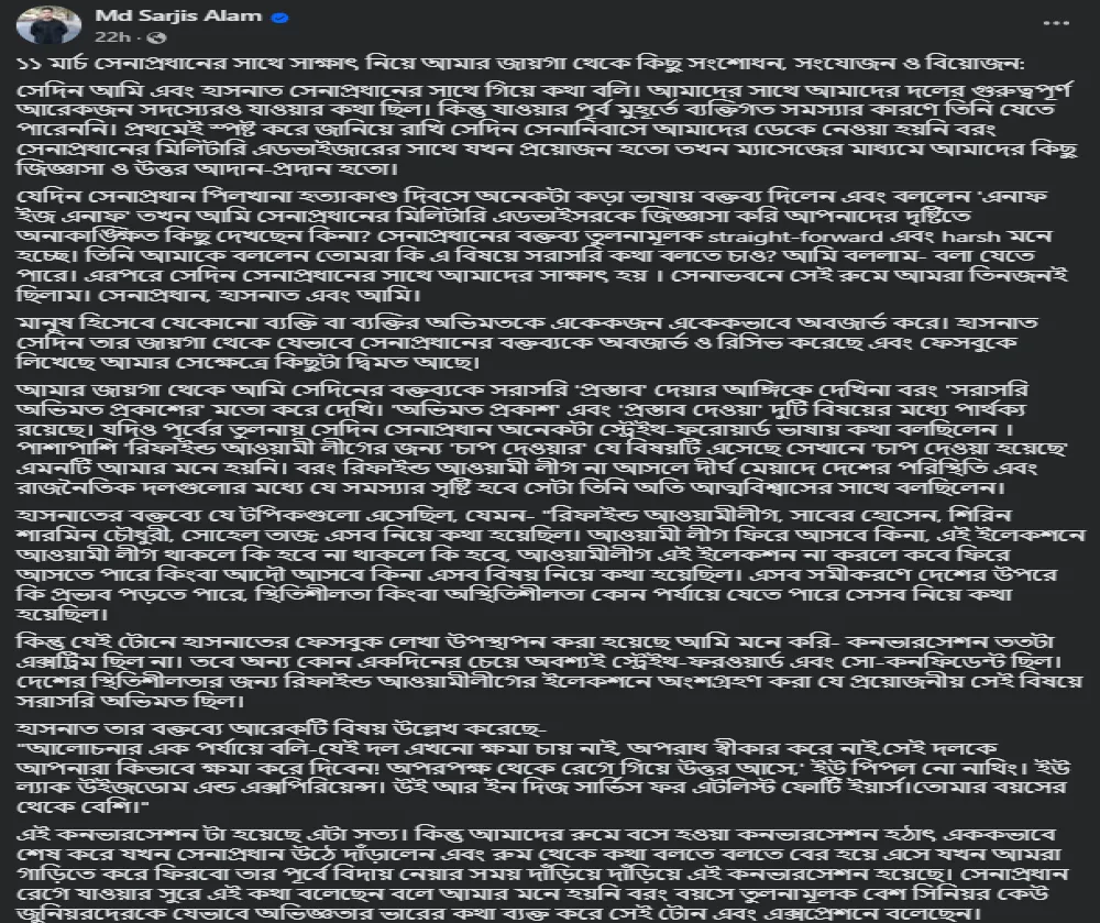 এর মধ্যে রোববার (২৩ মার্চ) এক ফেসবুক পোস্টে দলটির আরেক মুখ্য সংগঠক সারজিস আলম লেখেন, যেভাবে এই কথাগুলো ফেসবুক স্ট্যাটাসের মাধ্যমে এসেছে, এই প্রক্রিয়াটি আমার সমীচীন মনে হয়নি বরং এর ফলে পরবর্তীতে যেকোনো স্টেকহোল্ডারের সাথে আমাদের গুরুত্বপূর্ণ আলোচনা আস্থার সংকটে পড়তে পারে।