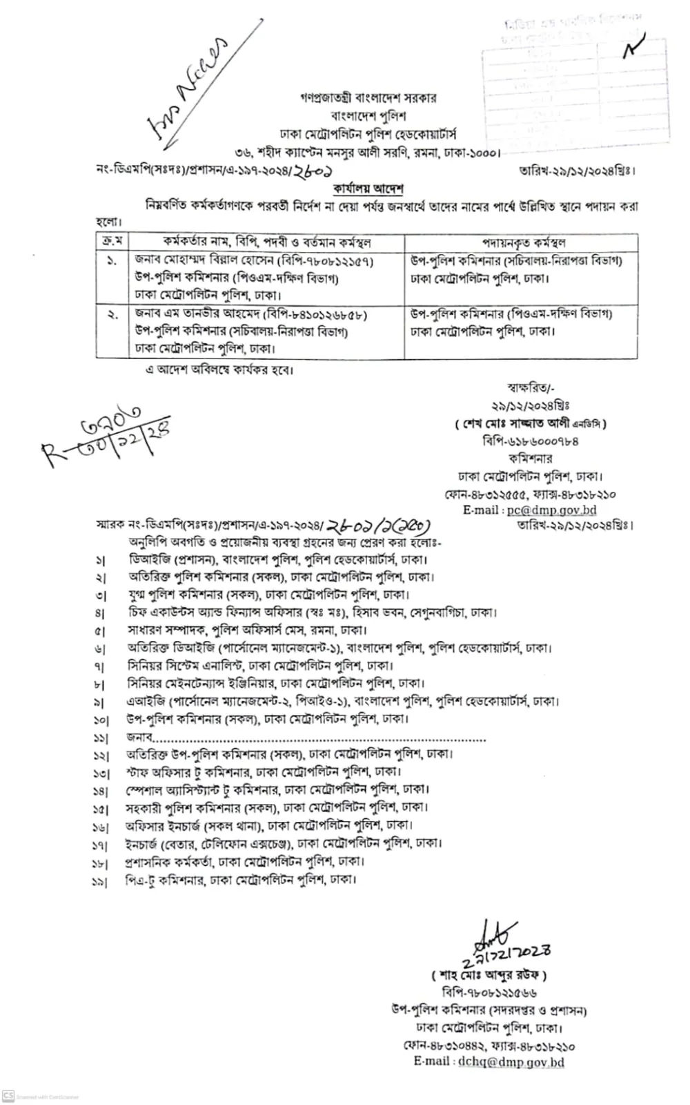 বাংলাদেশ সচিবালয় নিরাপত্তার দায়িত্বে নিয়োজিত ঢাকা মেট্রোপলিটন পুলিশের উপ-পুলিশ কমিশনার তানভীর আহমেদকে ডিএমপির দক্ষিণ পাবলিক অর্ডার ম্যানেজমেন্টে বদলি করা হয়েছে। পাবলিক অর্ডার ম্যানেজমেন্ট এর দক্ষিণের উপ-পুলিশ কমিশনার বিল্লাল হোসেনকে নতুন উপ-পুলিশ কমিশনার সচিবালয় নিরাপত্তা বদলি করা হয়েছে।