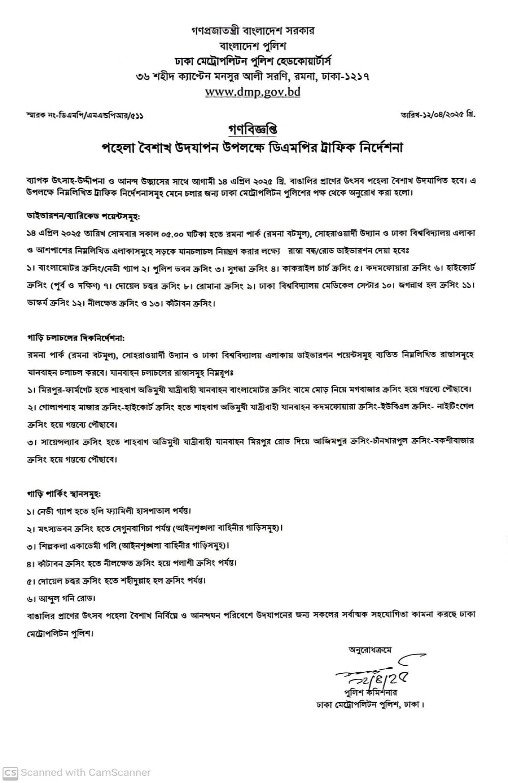পহেলা বৈশাখ উদযাপন উপলক্ষে ডিএমপির ট্রাফিক নির্দেশনা