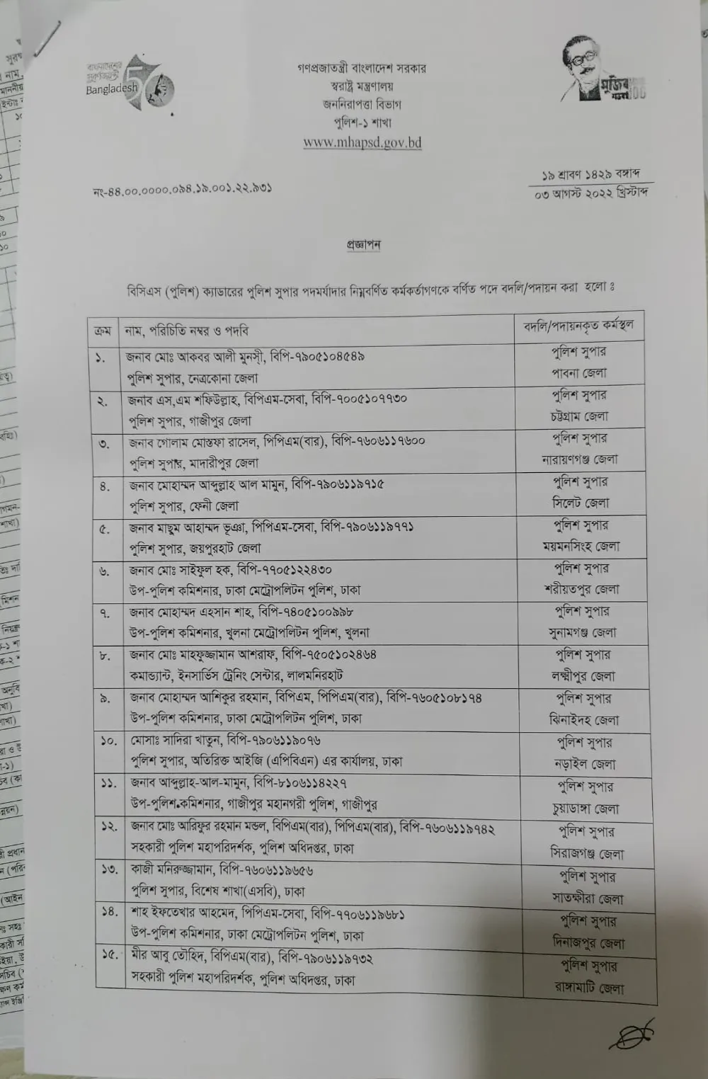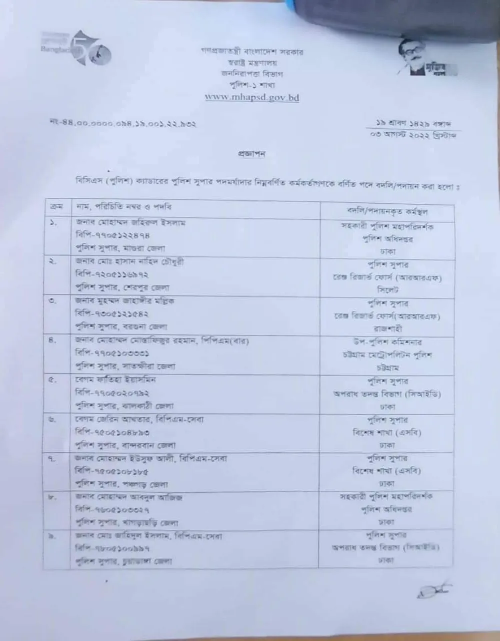 এদিকে এক আদেশে স্বরাষ্ট্র মন্ত্রণালয় জন নিরাপত্তা বিভাগ ১০ জেলার পুলিশ সুপারকে প্রত্যাহার করেছে। প্রসঙ্গত গতমাসে ২৫ জেলার পুলিশ সুপার অতিরিক্ত ডিআইজি পদে পদোন্নতি ও অন্যত্র পোস্টিং হয়। ২৫ জেলায় নতুন পুলিশ সুপার নিয়োগ সহ অন্যান্য জেলাগুলিতে রদবদল করা হয়।