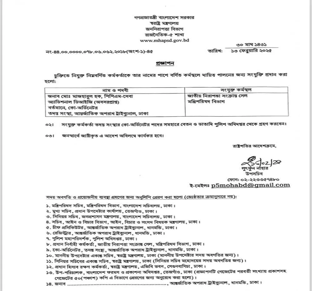 স্বরাষ্ট্র মন্ত্রণালয়ের প্রজ্ঞাপনে বলা হয়েছে, সংযুক্ত কর্মকর্তা মাযহারুল হক অপরাধ ট্রাইব্যুনালের তদন্ত সংস্থার কোর্ডিনেটরের সমাহারে বেতন পুলিশ অধিদপ্তর থেকে গ্রহণ করিবেন। মন্ত্রিপরিষদ বিভাগের জাতীয় নিরাপত্তা কমিটির সংক্রান্ত সেলে তাকে সংযুক্ত করা হয়েছে।