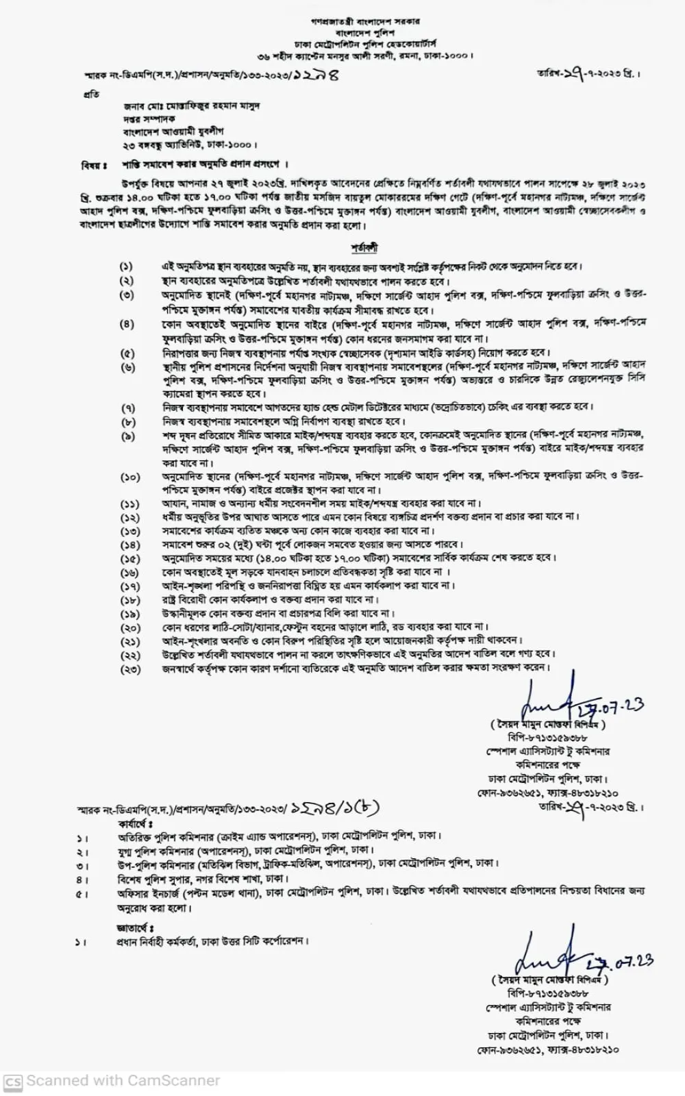 ডিএমপি কমিশনার বলেন, সম্মান প্রদর্শন করে আওয়ামী লীগের তিন অঙ্গ-ভ্রাতৃপ্রতিম সংগঠন ও বিএনপিকে সমাবেশ করার অনুমতি দেওয়া হলো। আওয়ামী লীগের তিন অঙ্গ সংগঠনকে জাতীয় মসজিদ বায়তুল মোকাররম দক্ষিণ গেটে ও বিএনপিকে পল্টন দলীয় কার্যালয়ে সমাবেশ করার অনুমতি দেওয়া হচ্ছে।