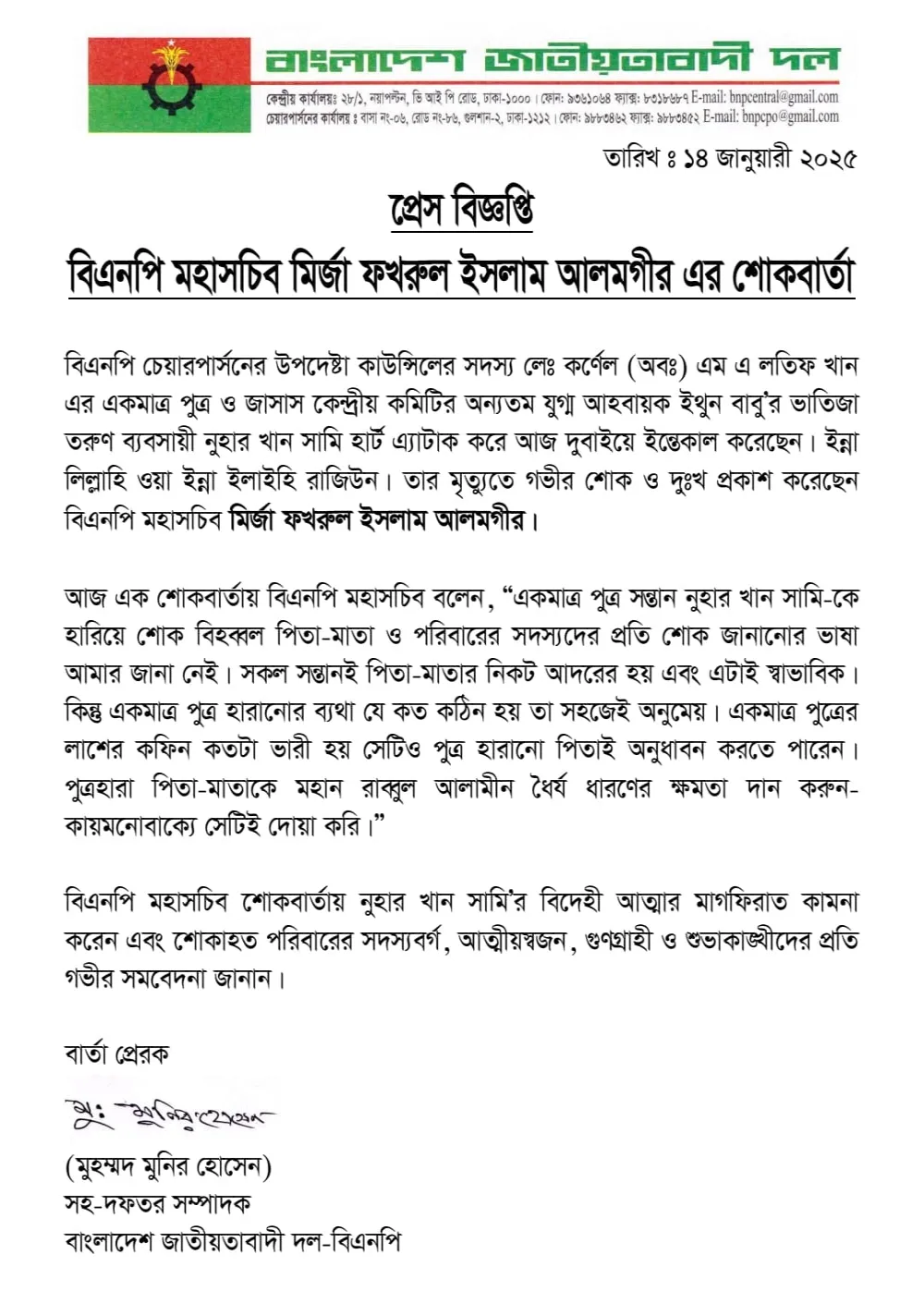 বিএনপি মহাসচিব শোকবার্তায় নুহার খান সামি’র বিদেহী আত্মার মাগফিরাত কামনা করেন এবং শোকাহত পরিবারের সদস্যবর্গ, আত্মীয়স্বজন, গুণগ্রাহী ও শুভাকাঙ্খীদের প্রতি গভীর সমবেদনা জানান।