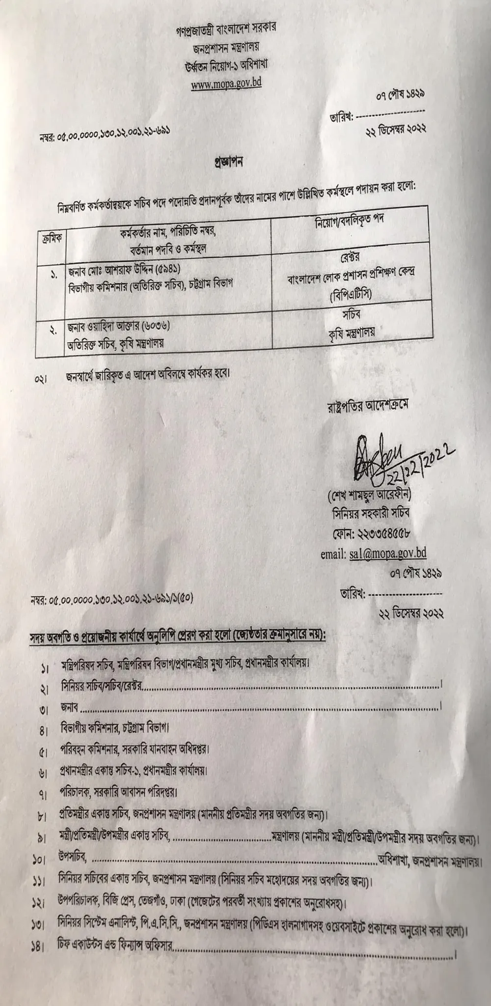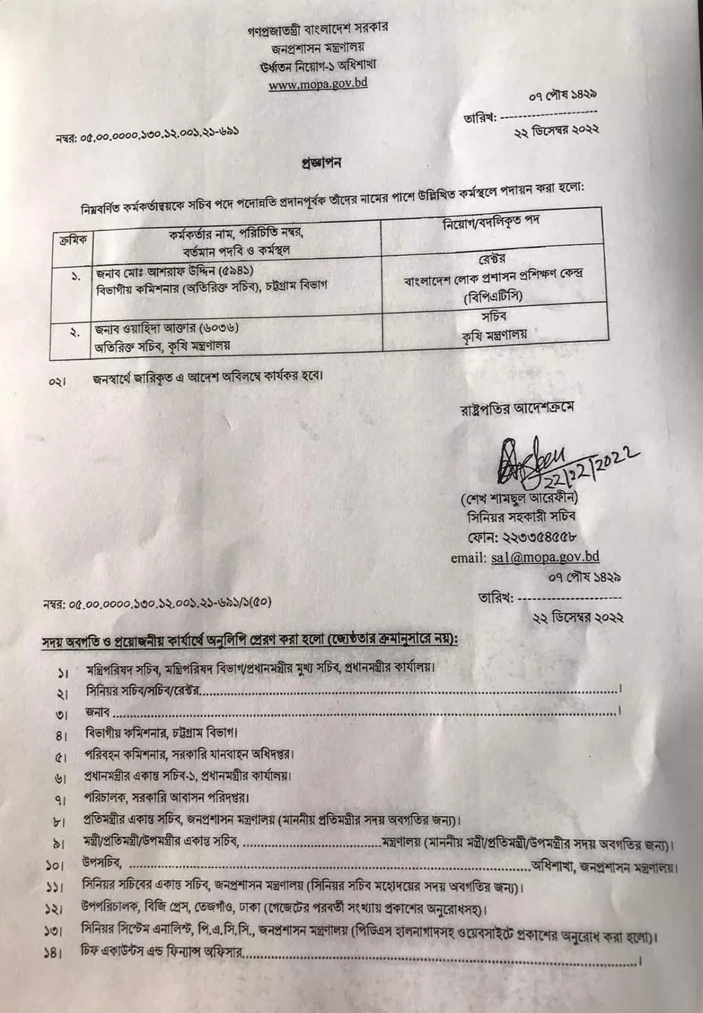 সিনিয়র সহকারী সচিব শেখ শামছুল আরেফীনের স্বাক্ষর করা প্রজ্ঞাপনে বলা হয়, ‘চট্টগ্রাম বিভাগীয় কমিশনার (অতিরিক্ত সচিব) মো. আশরাফ উদ্দিনকে সচিব হিসেবে বাংলাদেশ লোক প্রশাসন প্রশিক্ষণ কেন্দ্রে এবং কৃষি মন্ত্রণালয়ের অতিরিক্ত সচিব ওয়াহিদা আক্তারকে কৃষি মন্ত্রণালয়ে সচিব হিসেবে পদোন্নতি দেওয়া হলো। জনস্বার্থে জারি হওয়া এ আদেশ অবিলম্বে কার্যকর হবে।’