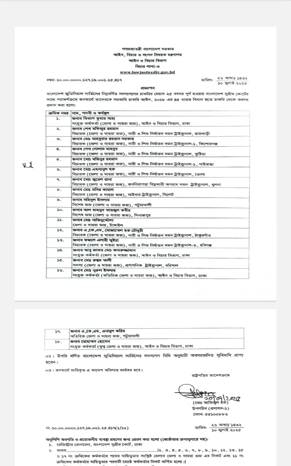 বাংলাদেশ জুডিশিয়াল সার্ভিসের সদস্য জেলা জজ ১৮ জন কর্মকর্তাকে বাধ্যতামূলক অবসর প্রদান করেছে সরকার। আইন বিচার ও সংসদ বিষয়ক মন্ত্রণালয়ের বিচার তিন শাখার উপসচিব আজিজুল হক স্বাক্ষরিত এক প্রজ্ঞাপনে চাকরির বয়স ২৫ বছর পূর্ণ হয় বাধ্যতামূলক অবসর প্রদান করা হয়। প্রজ্ঞাপনে বলা হয় বাংলাদেশ সুপ্রিম কোর্টের সাথে পরামর্শক্রমে জনস্বার্থে এ হাদীস জারি করা হয়।