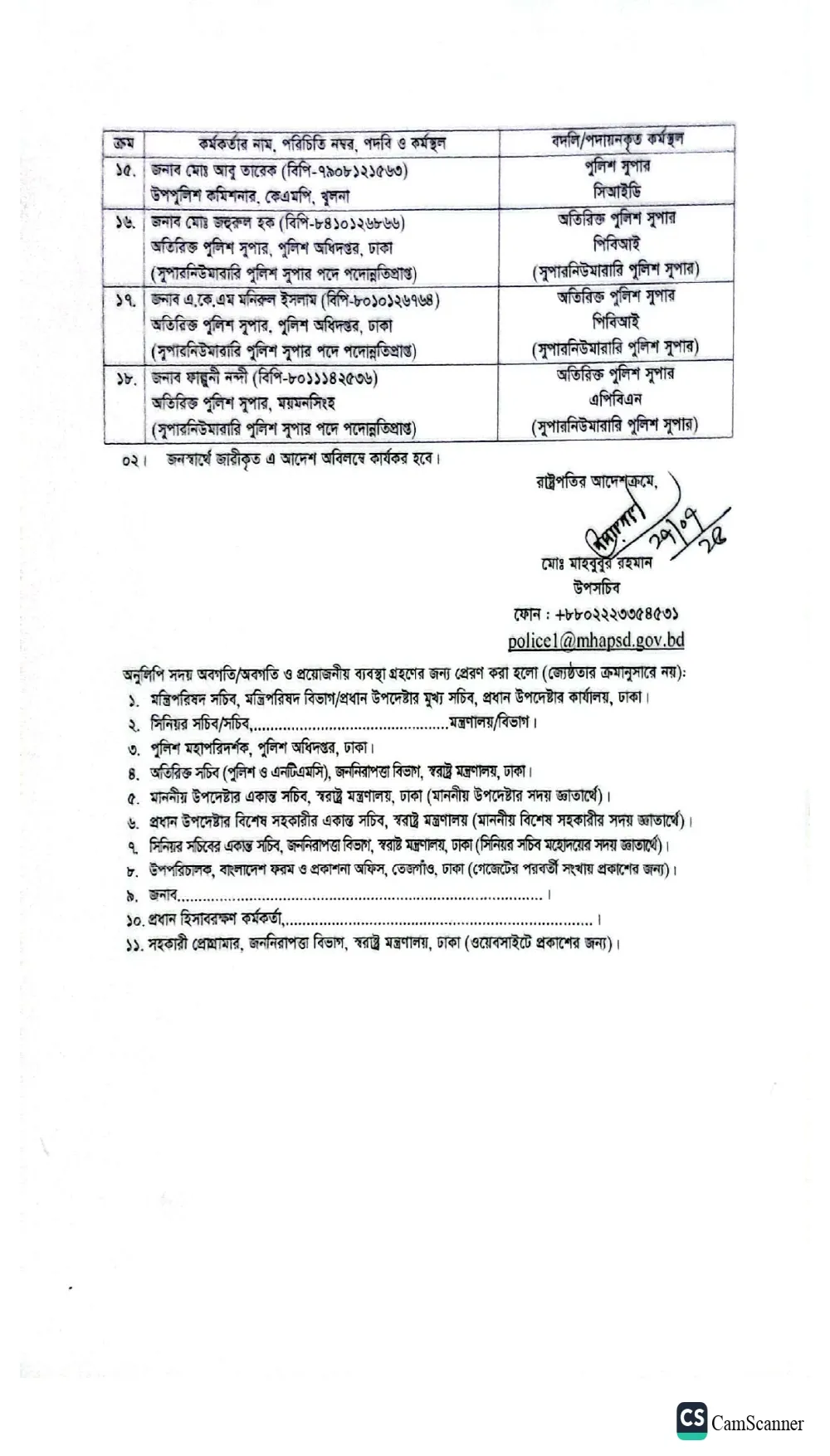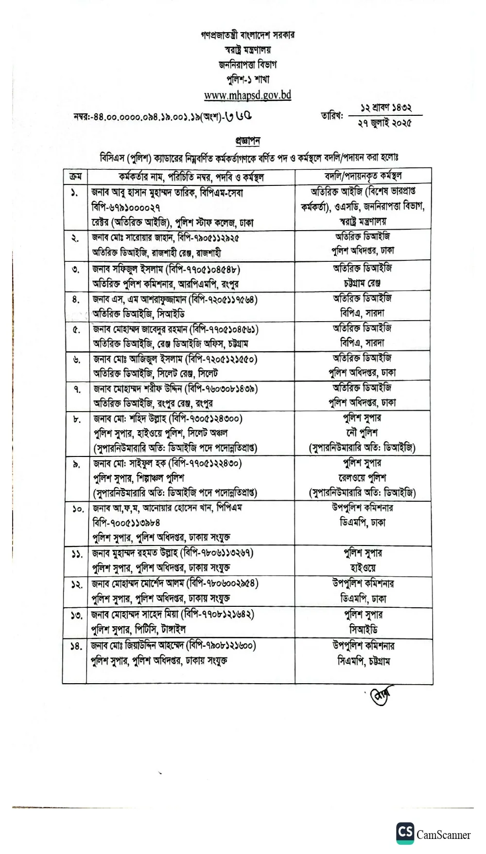 পুলিশের ঊর্ধ্বতন ২০ কর্মকর্তা বদলি