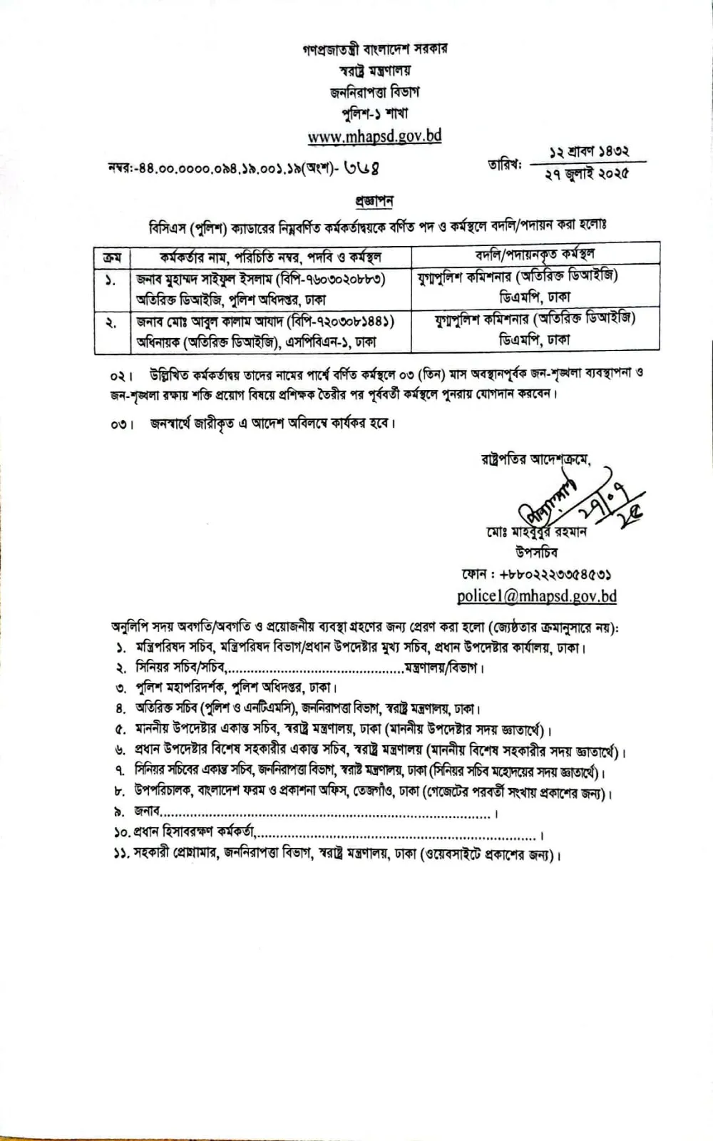 বাংলাদেশ পুলিশের অতিরিক্ত আইজিপি, অতিরিক্ত ডিআইজি ও পুলিশ সুপার পদমর্যাদার বিশ কর্মকর্তাকে বদলি করা হয়েছে। পুলিশ স্টাফ কলেজের রেক্টর অতিরিক্ত আইজিপি আবু হাসান মোহাম্মদ তারিককে স্বরাষ্ট্র মন্ত্রণালয়ের জননিরাপত্তা বিভাগে বিশেষ ভারপ্রাপ্ত কর্মকর্তা (ওএসডি) করা হয়েছে। স্বরাষ্ট্র মন্ত্রণালয়ের জননিরাপত্তা বিভাগের পুলিশ-১ শাখার উপসচিব মাহবুবুর রহমান স্বাক্ষরিত পৃথক দুটি প্রজ্ঞাপনে রোববার এই আদেশ জারি করা হয়।