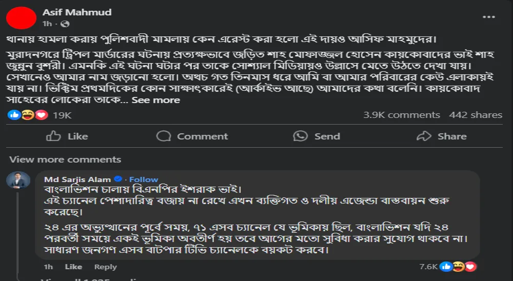 এদিকে এনসিপির উত্তরাঞ্চলের মুখ্য সংগঠক সারজিস আলম মন্তব্য করেন, “বাংলাভিশন পরিচালনা করছেন বিএনপির ইশরাক হোসেন। এই চ্যানেল এখন ব্যক্তিগত ও দলীয় এজেন্ডা বাস্তবায়ন করছে। ২৪ পরবর্তী সময়েও যদি ৭১ সালের মতো ভূমিকা নেয়, তবে বয়কট হবে অনিবার্য।”